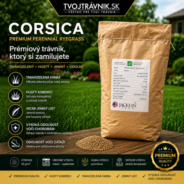 CORSICA predstavuje prémiovú odrodu mätonohu trváceho, určenú pre náročných zákazníkov, ktorí očakávajú dokonalý vzhľad a dlhodobú kvalitu trávnika. Vyniká kombináciou tmavozelenej farby, extrémnej hustoty porastu a veľmi jemného listu, čím vytvára vizuálne atraktívny, kompaktný trávnik bez prázdnych miest.