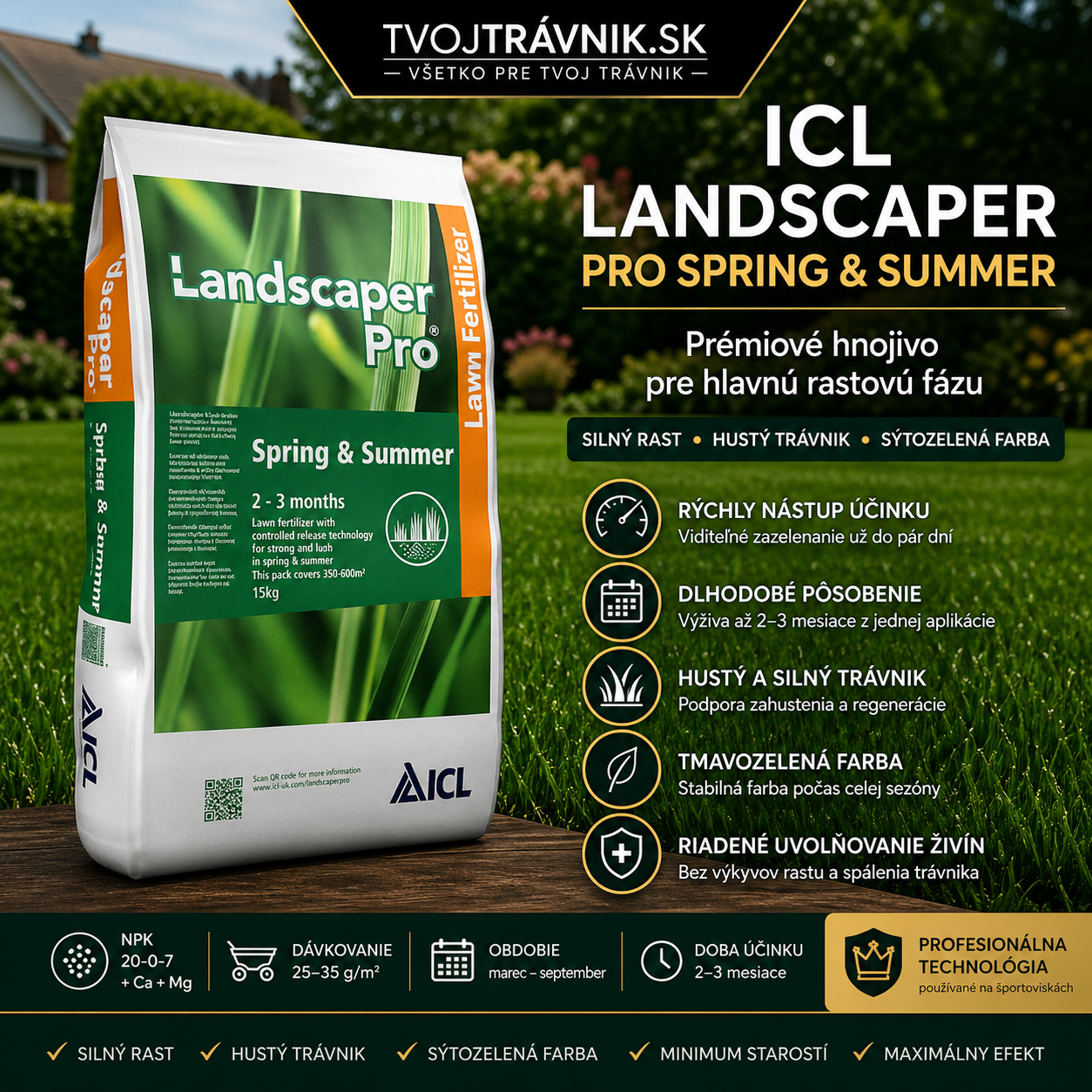 ICL Landscaper Pro Spring and Summer je profesionálne jarné hnojivo na trávnik s riadeným uvoľňovaním živín, určené na hlavnú rastovú fázu. Vysoký obsah dusíka podporuje rýchly štart po zime, zahustenie porastu a sýto zelenú farbu.